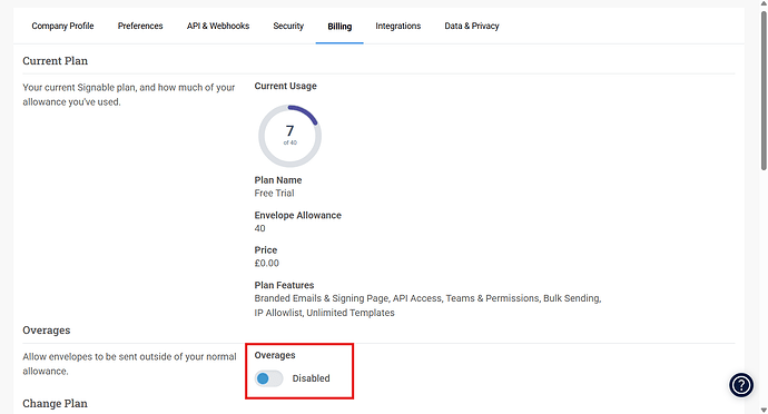 Overages are charged monthly at a rate of £1.50 + VAT per envelope sent outside your allowance. They are not activated automatically, and need to be enabled via your Subscriptions and Billing page within Signable.