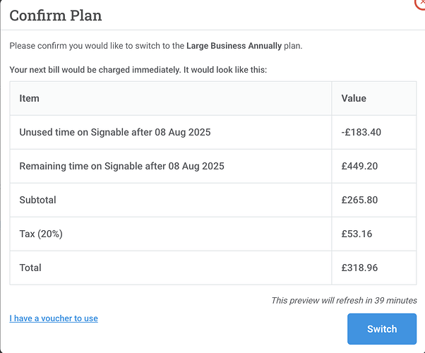 You actually see a full breakdown of your pro-rated upgrade fee within your Signable account! In the Subscriptions and Billing section, simply select to ‘Switch’ next to the increased plan and review the charges, example below: